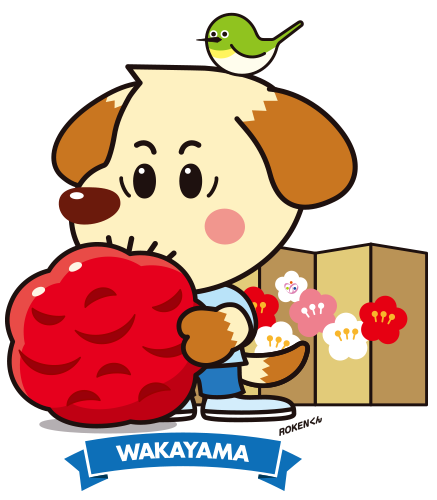 梅干しを食べてすっぱい顔をしている「わかやまROUKENくん」です。「県の花 うめ」と「県の鳥 めじろ」もいます。